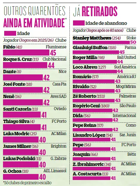 Na edição de 2025/26 da liga portuguesa, são três os quarentões já utilizados. Deste lote, o mais mediático é Thiago Silva, cinco meses mais velho do que Ronaldo e reforço do FC Porto. Antes dele, porém, já outros dois marcavam presença de forma regular na prova: José Fonte, que celebrou o 42.º aniversário em dezembro passado, ainda é titular indiscutível no Casa Pia; e Nenê, que em julho fará 43 anos, continua a ser utilizado de forma regular no Aves SAD, ainda que a sair do banco, somando já quatro golos nessa condição.