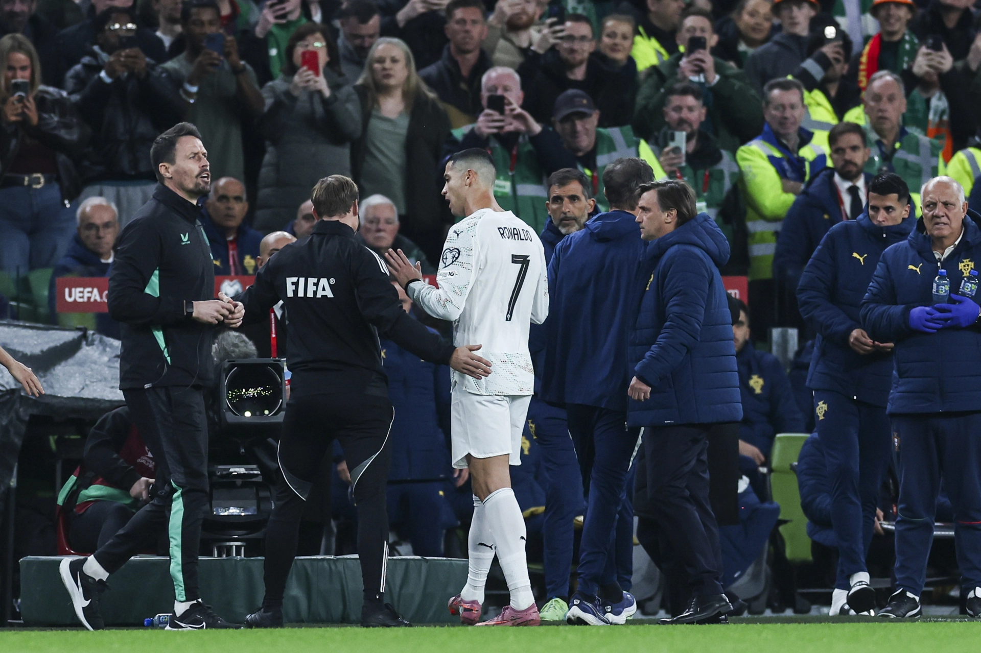 Depois de recorrer às imagens - em que se vê o avançado a dar uma cotovelada no adversário -, o nórdico anulou o amarelo que tinha exibido a Ronaldo inicialmente e exibiu-lhe o vermelho direto, numa altura em que Portugal estava a perder em Dublin, por 2-0, face aos dois golos de Troy Parrott na primeira parte.