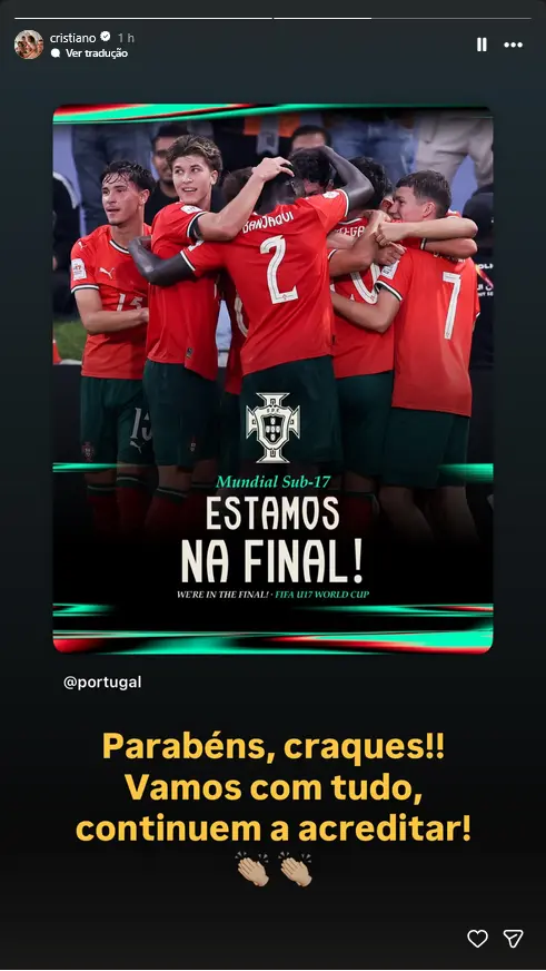 Portugal qualificou-se esta segunda-feira para a final do Mundial de sub-17, ao eliminar o Brasil no desempate por grandes penalidades, e Cristiano Ronaldo já reagiu com mensagem de força.