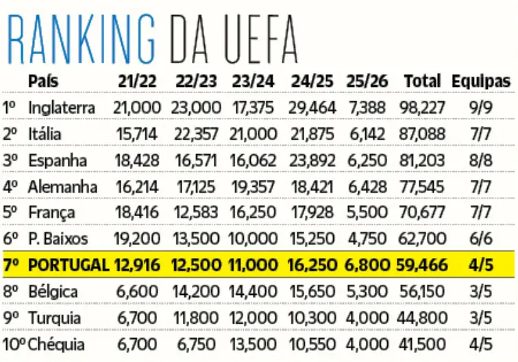 Portugal começou a época numa excelente recuperação sobre os Países Baixos, mas na quarta-feira perdeu uns pontos nessa luta: enquanto o Benfica acabou derrotado, o PSV festejou um precioso triunfo para estas contas, permitindo aos neerlandeses, na sexta posição, estarem agora com mais 3,234 pontos do que Portugal, que é sétimo.