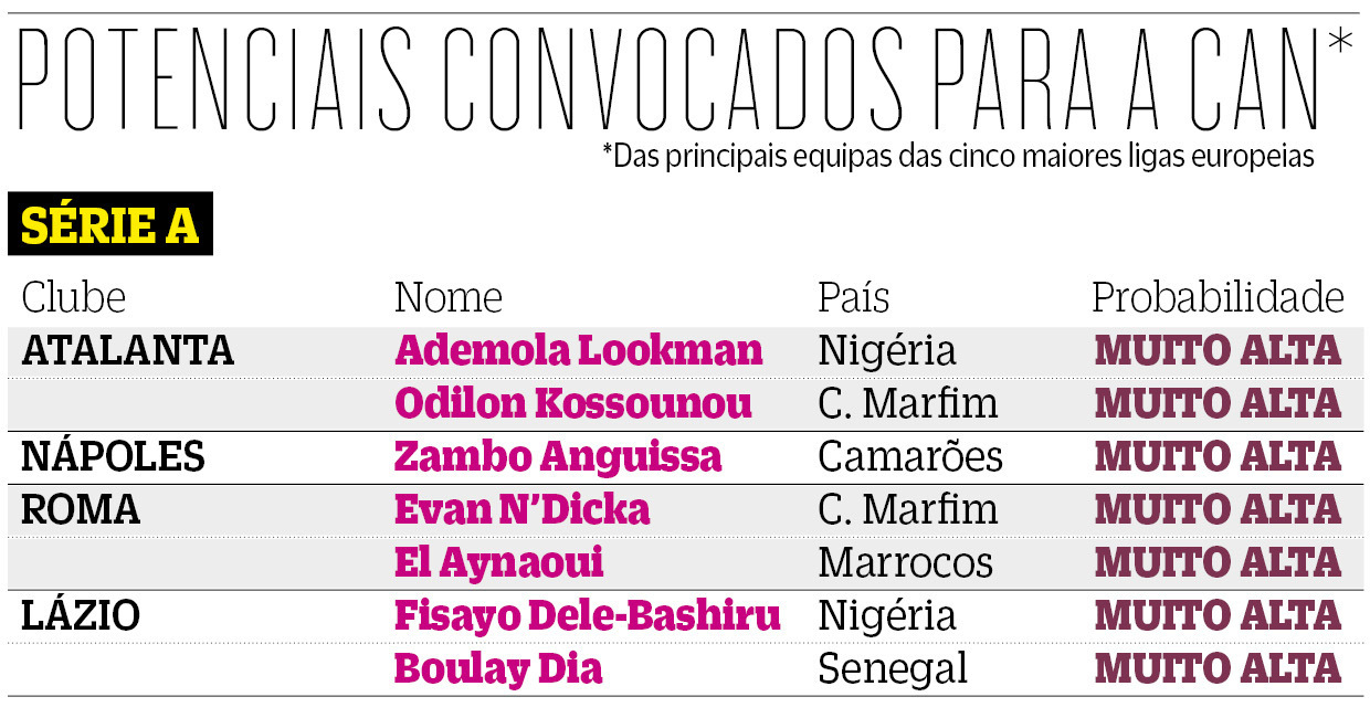 Em Itália, o campeão Nápoles fica sem o indiscutível Anguissa no meio-campo, enquanto uma das equipas mais desfalcadas será a Atalanta, não tanto pela quantidade, mas pela qualidade: a grande estrela Ademola Lookman vai por certo ser chamada a dar o contributo à Nigéria.