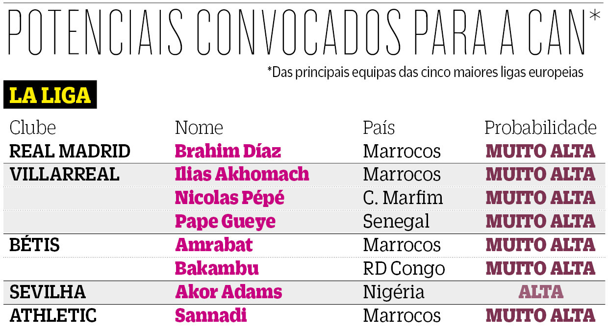 Em França, o PSG fica sem o marroquino Hakimi, com o Lille a perder nada menos do que seis elementos do plantel. Já na Alemanha, o Leverkusen fica sem cinco nomes e o Bayern perde Nico Jackson no ataque.