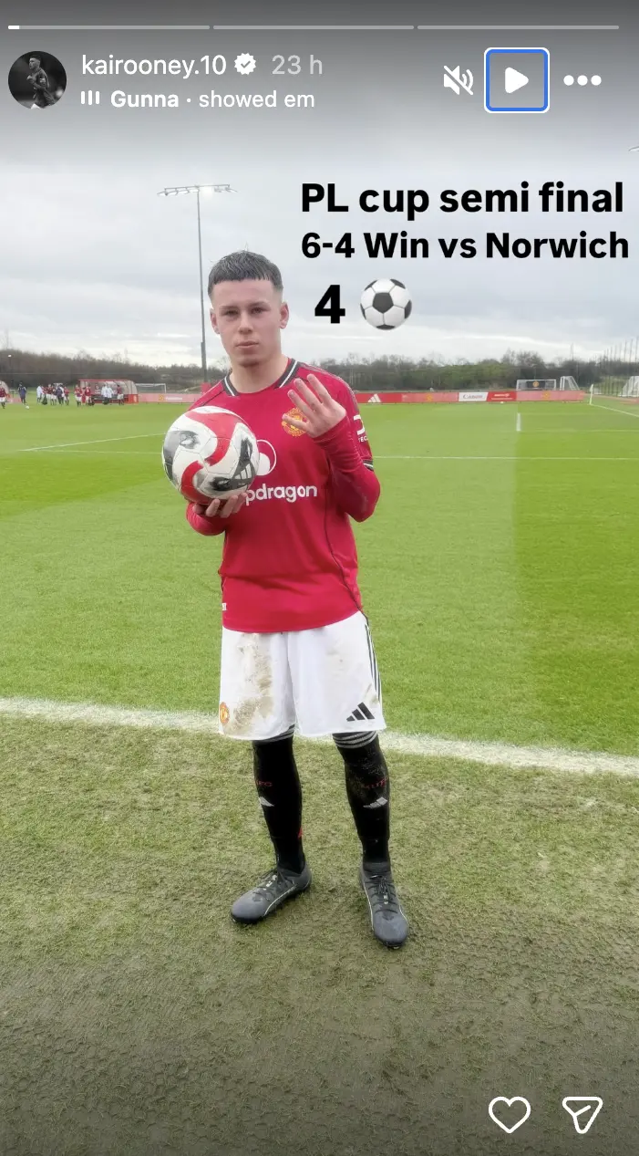 O filho de Wayne Rooney, Kai Rooney, apontou no sábado um póquer no triunfo da equipa de sub-16 do Manchester United sobre o Norwich, por 6-4, em jogo das meias-finais da Premier League Cup daquele escalão que apurou os red devils para a final.
