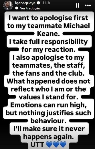 "Quero pedir desculpa primeiro ao meu colega de equipa Michael Keane. Assumo toda a responsabilidade pela minha reação. Quero também pedir desculpa aos meus colegas de equipa, ao staff, aos adeptos e ao clube. O que aconteceu não reflete quem sou ou os valores que defendo. As emoções podem elevar-se, mas nada justifica um comportamento destes. Vou certificar-me de que nunca voltará a acontecer", pode ler-se.