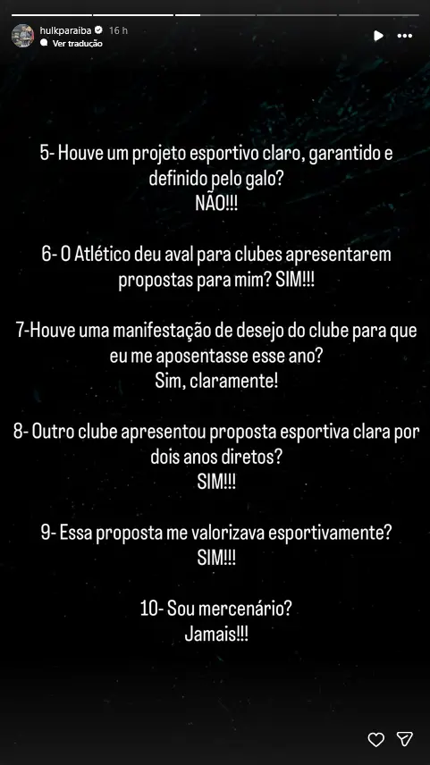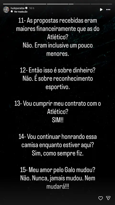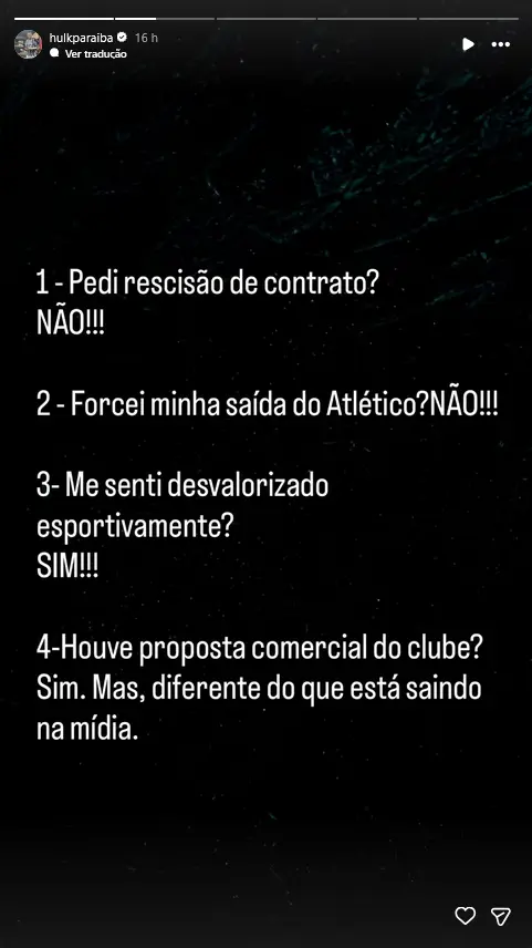 Após notícias de que Hulk tinha pedido uma rescisão amigável para deixar já em janeiro o Atlético Mineiro, o jogador fez um esclarecimento nas redes sociais, onde refere que vai cumprir o ano de contrato que lhe falta, apesar de se sentir desvalorizado e sem o devido reconhecimento pelo clube. O Fluminense, que apresentou uma proposta concreta ao jogador, porém, não vê o caso como encerrado e continua a pretender contratá-lo nesta janela de mercado.