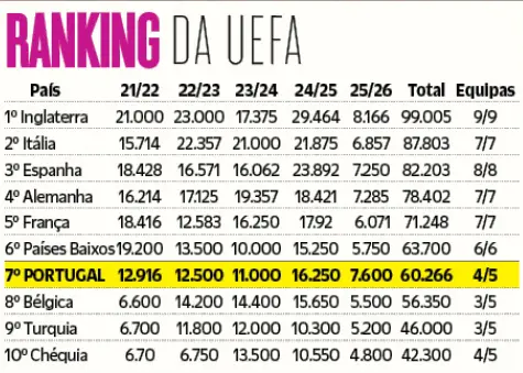 Numa jornada em que o Braga venceu (2-0 na receção ao Estrela Vermelha) e o FC Porto perdeu (2-0 em casa do Nottingham Forest), Portugal somou 0,400 pontos para o Ranking UEFA 2025/26, enquanto os Países Baixos, com as vitórias de Feyenoord, Go Ahead Eagles e AZ Alkmaar, somou 1,000 pontos, aumentando a sua vantagem no ranking a cinco anos.