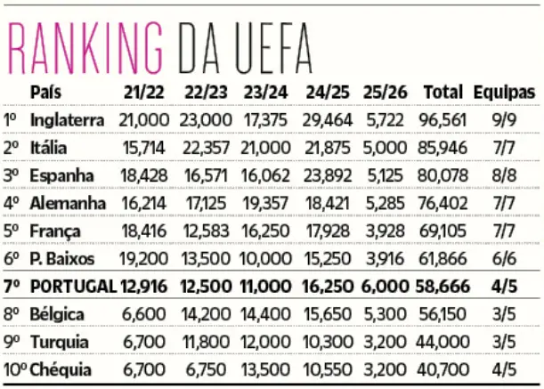 Quanto às contas do Ranking UEFA, o desaire do Benfica só deixou Portugal sem qualquer ponto ontem, situação amenizada pelos desaires de Ajax e Brugge, dos Países Baixos e Bélgica.
