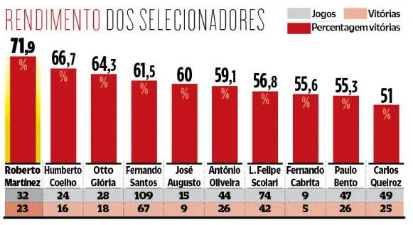 Em dois anos e meio no cargo, Roberto Martínez tem um percurso à prova de bala se se olhar para os números. O treinador espanhol já é o que detém a percentagem mais elevada de vitórias e apresenta uma margem confortável para o segundo classificado, distância que pode aumentar com a dupla jornada da Seleção Nacional na fase de apuramento para o Campeonato do Mundo de 2026, frente à República da Irlanda, no sábado, e Hungria, na terça-feira, dois adversários teoricamente acessíveis.
