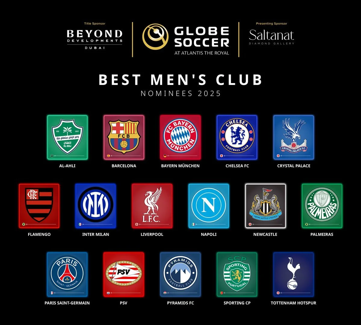 Clube masculino do ano: Al-Ahli, Paris Saint-Germain, Barcelona, Chelsea, Liverpool, Pyramids FC, Inter, Newcastle, Bayern Munique, Palmeiras, Sporting, Crystal Palace, Flamengo, Nápoles, PSV e Tottenham.