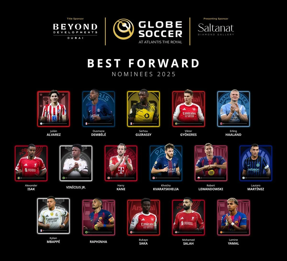 Avançado do ano: Kylian Mbappé, Mohamed Salah, Dembélé, Erling Haaland, Lamine Yamal, Raphinha, Kvaratskhelia, Viktor Gykeres, Julián Alvarez, Vinícius Jr., Harry Kane, Alexandre Isak, Lewandowski, Lautaro Martínez e Bukayo Saka.