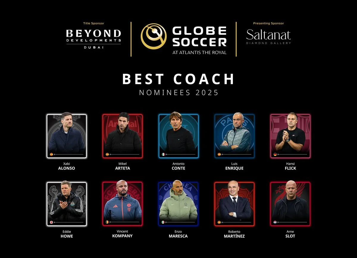 Treinador do ano: Luís Enrique, Xabi Alonso, Hansi Flick, Enzo Maresca, Roberto Martínez, Mikel Arteta, Vincent Kompany, Antonio Conte, Eddie Howe e Slot Arne.