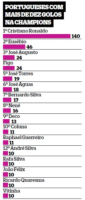 Ao marcar na terça-feira frente ao Chelsea, na Liga dos Campeões, Vitinha entrou num lote restrito de jogadores portugueses que apontaram pelo menos dez golos na principal prova de clubes da UEFA. Uma lista encabeçada pelo inatingível Cristiano Ronaldo, que é recordista mundial com 140, e onde se incluem mais 14 futebolistas lusos. De entre eles, além de Vitinha e Ronaldo, contam-se apenas mais cinco que ainda estão em atividade: Bernardo Silva, Raphael Guerreiro, André Silva, João Félix e Rafa Silva.
