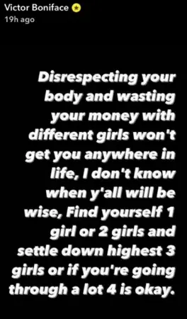 "A vida é como um sapato, não se pode beber uma vaca porque a terra é uma cenoura. Se desperdiçares dinheiro com muitas mulheres, não vais conseguir nada na vida. Encontra uma ou duas e relaxa. Três mulheres no máximo, ou se estiveres a passar por um período difícil, quatro estão bem", escreveu o jogador no seu perfil de Snapchat.