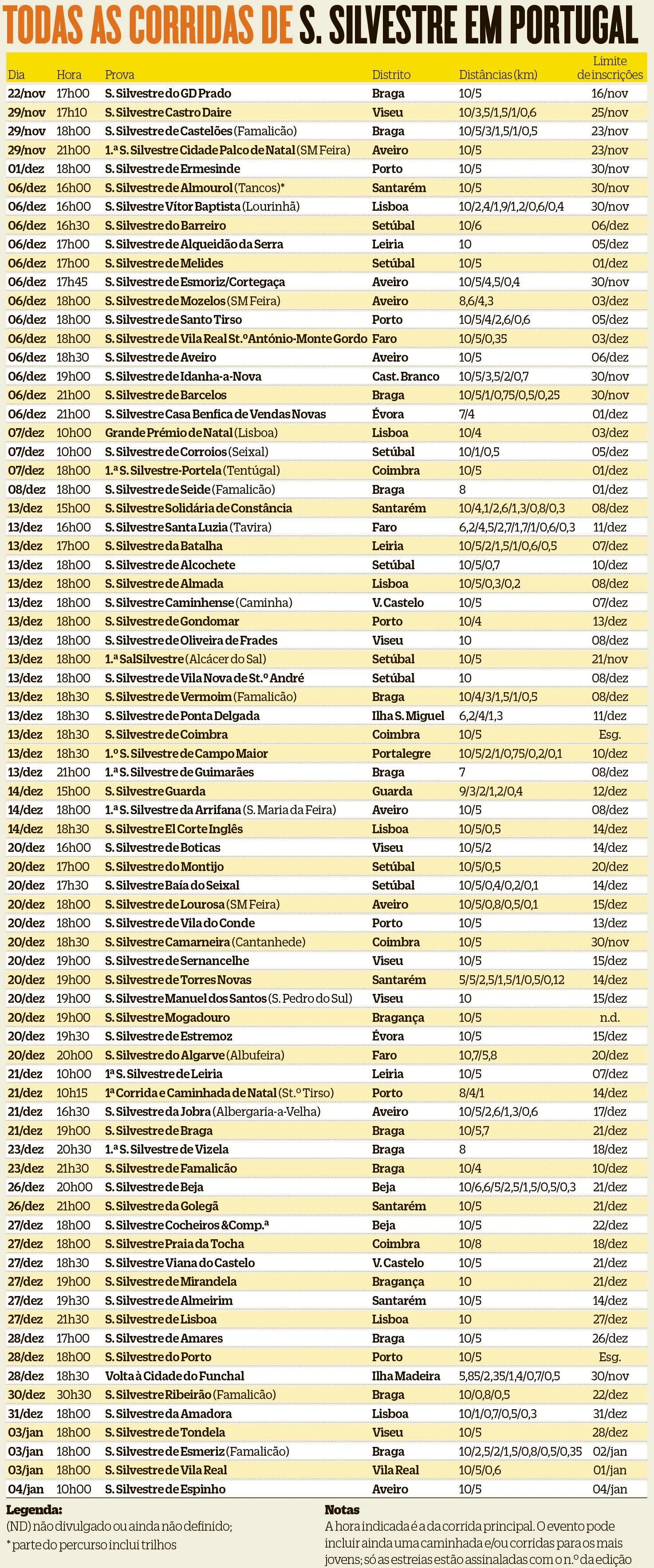 A primeira do calendário foi a do Prado, em Braga, no último sábado, e a última realiza-se a 4 de janeiro, numa estratégia da S. Silvestre de Espinho para fugir ao denso calendário de dezembro. A única que ainda mantém a tradição de ser disputada na última noite do ano é a da Amadora. O tiro de partida está marcado para as 18h00, para não estragar o réveillon.