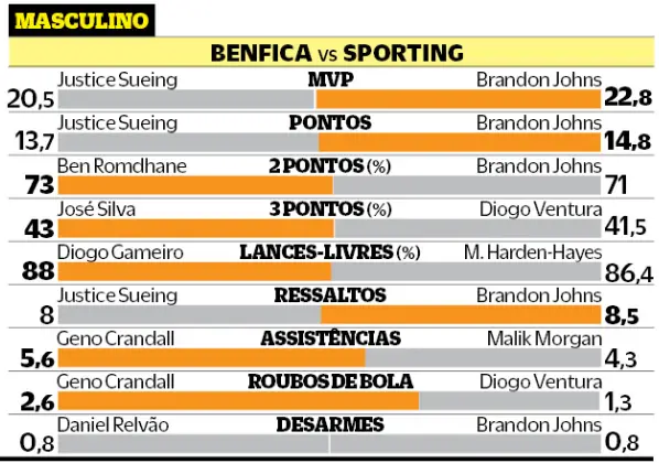 No masculino, cujos dérbis lisboetas foram reativados em 2019/20, Benfica e Sporting estão muito mais próximos, em primeiro e segundo, respetivamente, apenas separados por dois triunfos. Na primeira volta, os tetracampeões nacionais foram avassaladores no João Rocha (66-103), buscando amanhã a sexta vitória consecutiva sobre os leões. Os homens de Luís Magalhães, dominadores de dérbis de fevereiro de 2020 a fevereiro de 2022, cresceram a olhos vistos após o desaire da segunda ronda de 2025/26, tentando agora dar uma nova imagem na Luz e colar-se à liderança.
