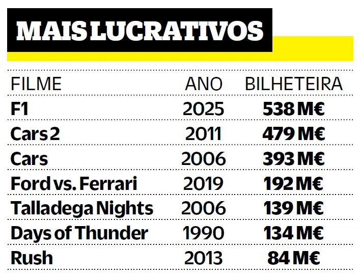 O filme, que envolveu toda a F1 e teve Lewis Hamilton entre os produtores, superou os dois primeiros "Cars" - curiosamente ficou aquém de ambos nos cinemas norte-americanos - e bateu por muito os célebres "Ford vs. Ferrari" e "Rush". Se contabilizarmos os filmes com automóveis em papel central, o "F1" perdeu para quatro da saga "Fast & Furious".