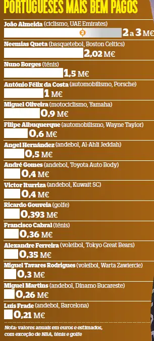 João Almeida, segundo na Volta a Espanha e vencedor de País Basco, Romandia e Suíça, é um dos atletas portugueses que melhor guarda o segredo sobre os seus rendimentos, que este ano podem ter atingido os três milhões de euros, acima de Neemias Queta, basquetebolista que tem o salário nos Boston Celtics bem explícito: ganha 2 349 578 dólares anuais, equivalentes a pouco mais de dois milhões de euros, reduzidos a 1,84 milhões após impostos. Ambos fizeram história tanto na competição como na conta bancária, pois nunca um atleta português fora do futebol recebera na casa dos dois milhões.