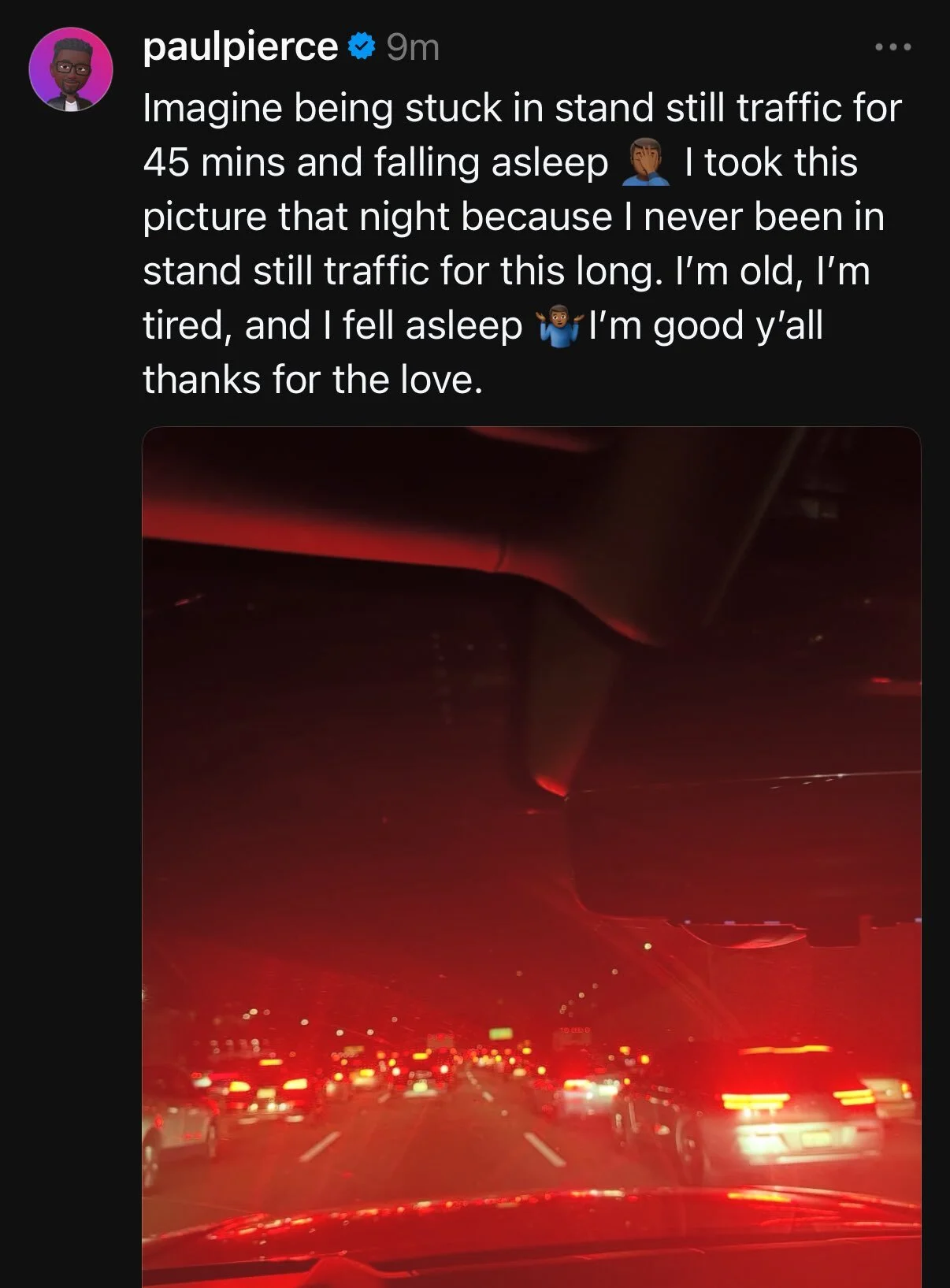 O jogador respondeu, numa publicação no Threads: "Imaginem ficar parados no trânsito durante 45 minutos e adormecer. Tirei esta fotografia nessa noite porque nunca estive assim parado no trânsito por tanto tempo. Estou velho, estou cansado e adormeci. Estou bem, obrigado a todos pelo carinho."