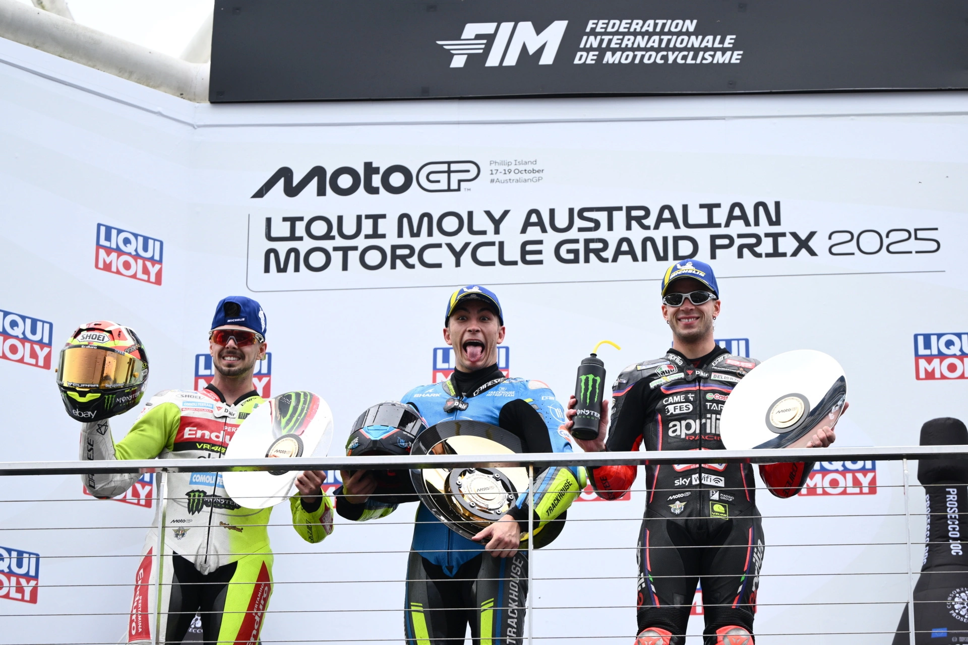 Bezzecchi baixaria ao sétimo lugar após cumprir a passagem pelo traçado mais longo da volta ao circuito de Philip Island, acabando por recuperar até ao degrau mais baixo do pódio.