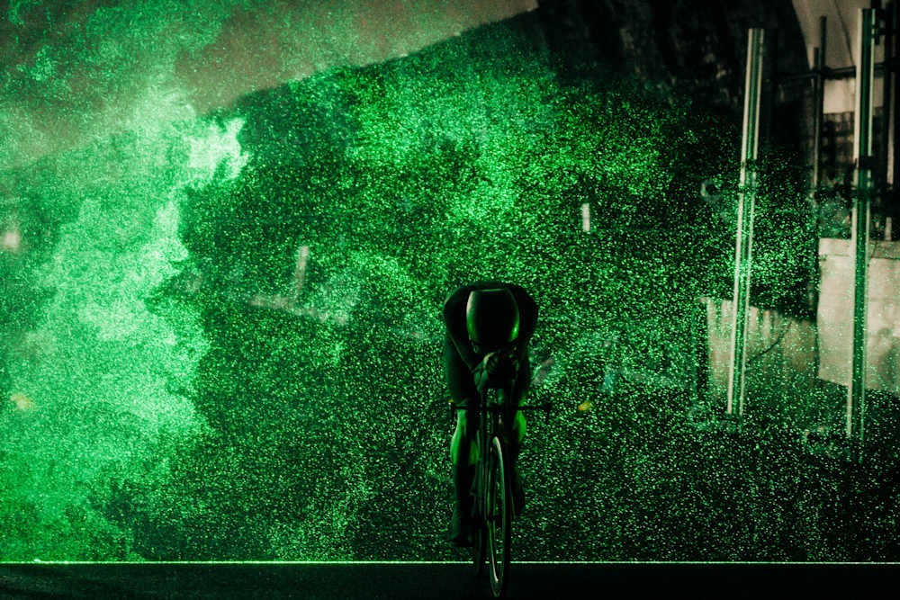 Durante as experiências, milhões de microbolhas de hélio foram iluminadas por feixes de laser, permitindo registar com precisão o movimento do ar à volta do atleta e do equipamento. Cada ciclista realizou mais de 100 passagens sob uma "cortina" verde de bolhas e luz laser, para recolher dados exatos sobre posição, postura e velocidade.