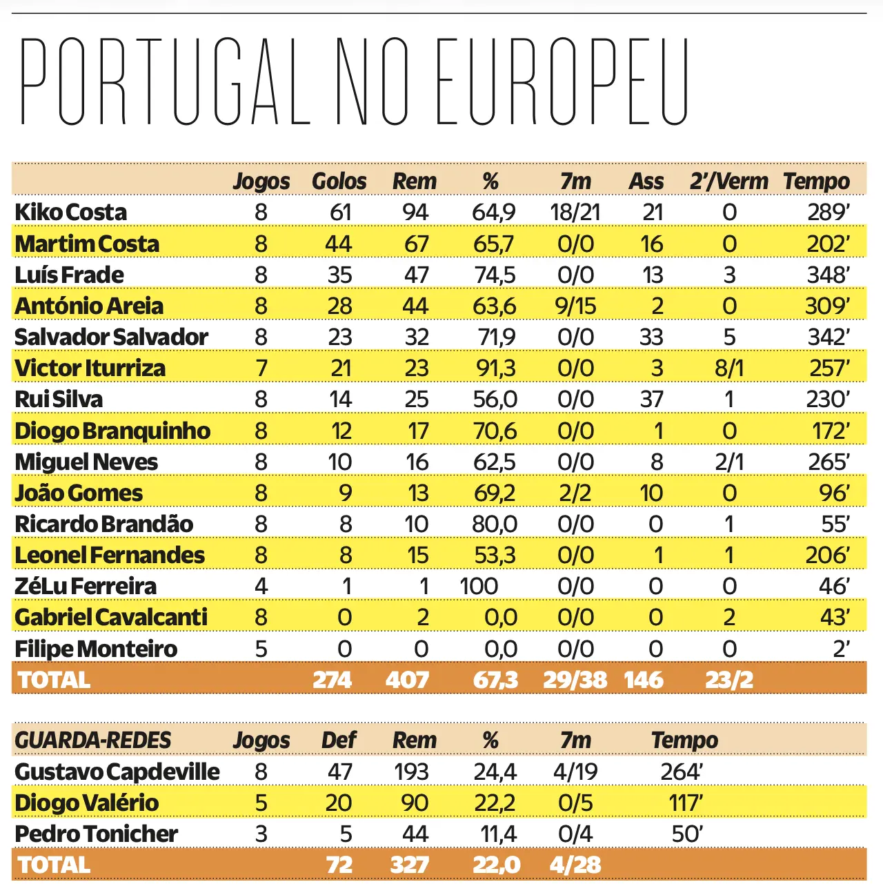 O que provavelmente excedeu as expectativas foi Portugal exibir um dos melhores ataques na história dos Europeus - e naquele que teve o recorde de 31,1 golos por jogo -, a meio termo entre a eficácia dinamarquesa e a velocidade dos franceses, que atingiram inéditas 61,6 posses de bola por jogo, mais dez do que os campeões. Onde os Heróis do Mar terão pecado foi na defesa, pelos números considerada a segunda pior das equipas que chegaram ao main round, embora aqui a estatística não diga tudo.