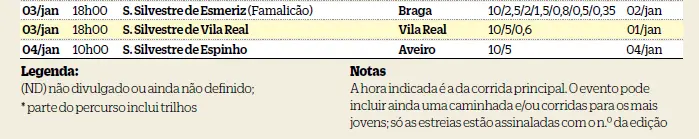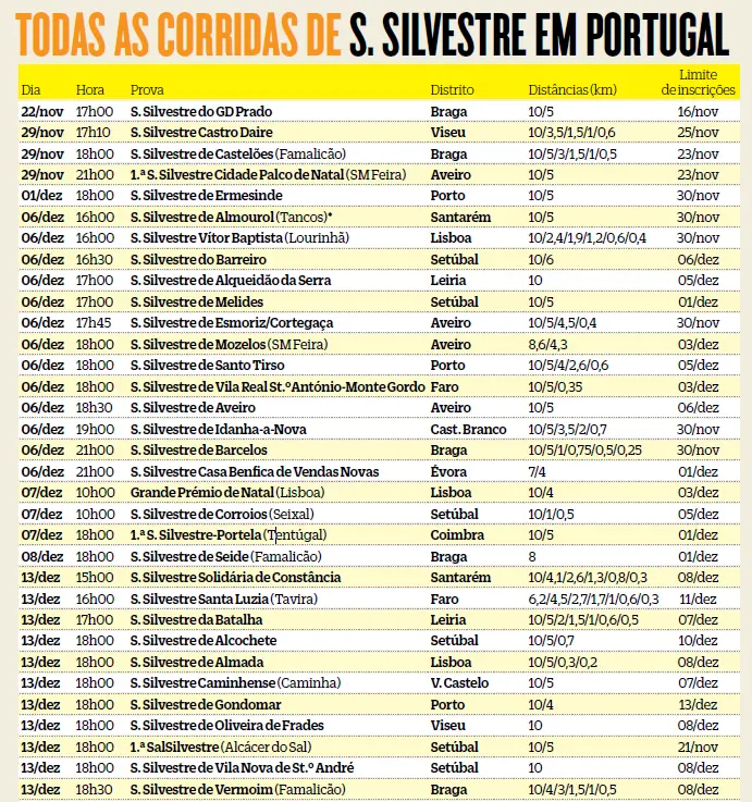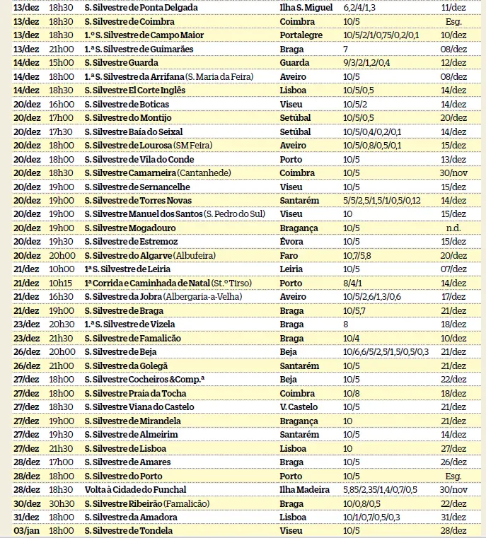 A primeira do calendário é a do Prado, em Braga, já este sábado, e a última realiza-se a 4 de janeiro, numa estratégia da S. Silvestre de Espinho para fugir ao denso calendário de dezembro. A única que ainda mantém a tradição de ser disputada na última noite do ano é a da Amadora. O tiro de partida está marcado para as 18h00, para não estragar o réveillon.