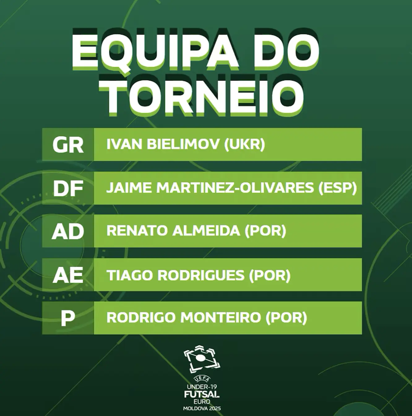 Portugal, que se sagrou bicampeão europeu de futsal de sub-19, "colocou" três jogadores no cinco ideal da prova que se disputou na Moldávia: Renato Almeida, Tiago Rodrigues e Rodrigo Monteiro.