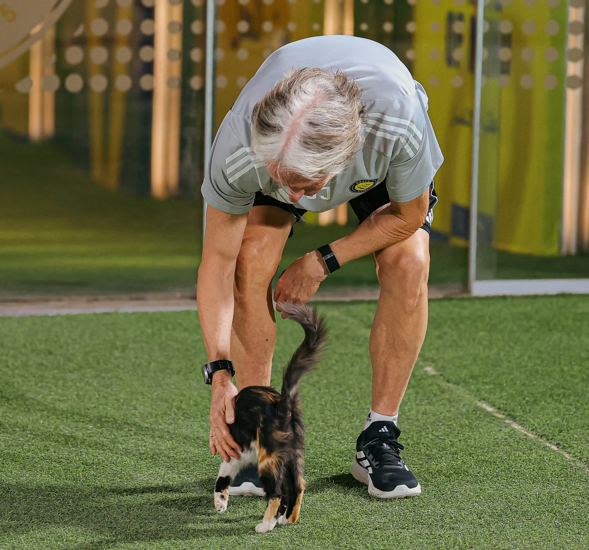 "Eu gosto de cães, não gosto de gatos", disse o treinador do Al Nassr, enquanto acariciava um gato. Aconteceu antes de um treino do Al Nassr